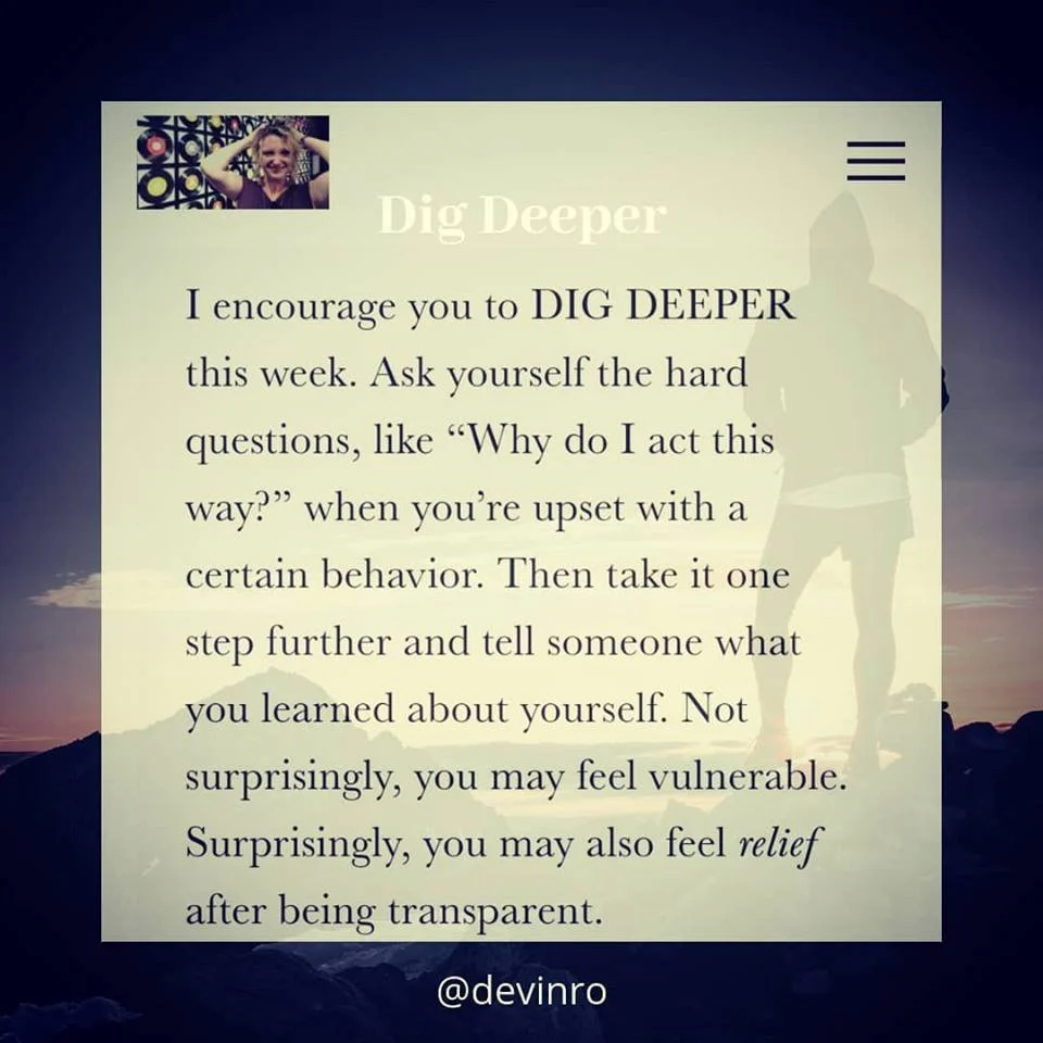 I encourage you to DIG DEEPER this week. Ask yourself the hard questions, like “Why do I act this way?” when you’re upset with a certain behavior. Then take it one step further and tell someone what you learned about yourself. Not surprisingly, you may feel vulnerable. Surprisingly, you may also feel relief after being transparent.